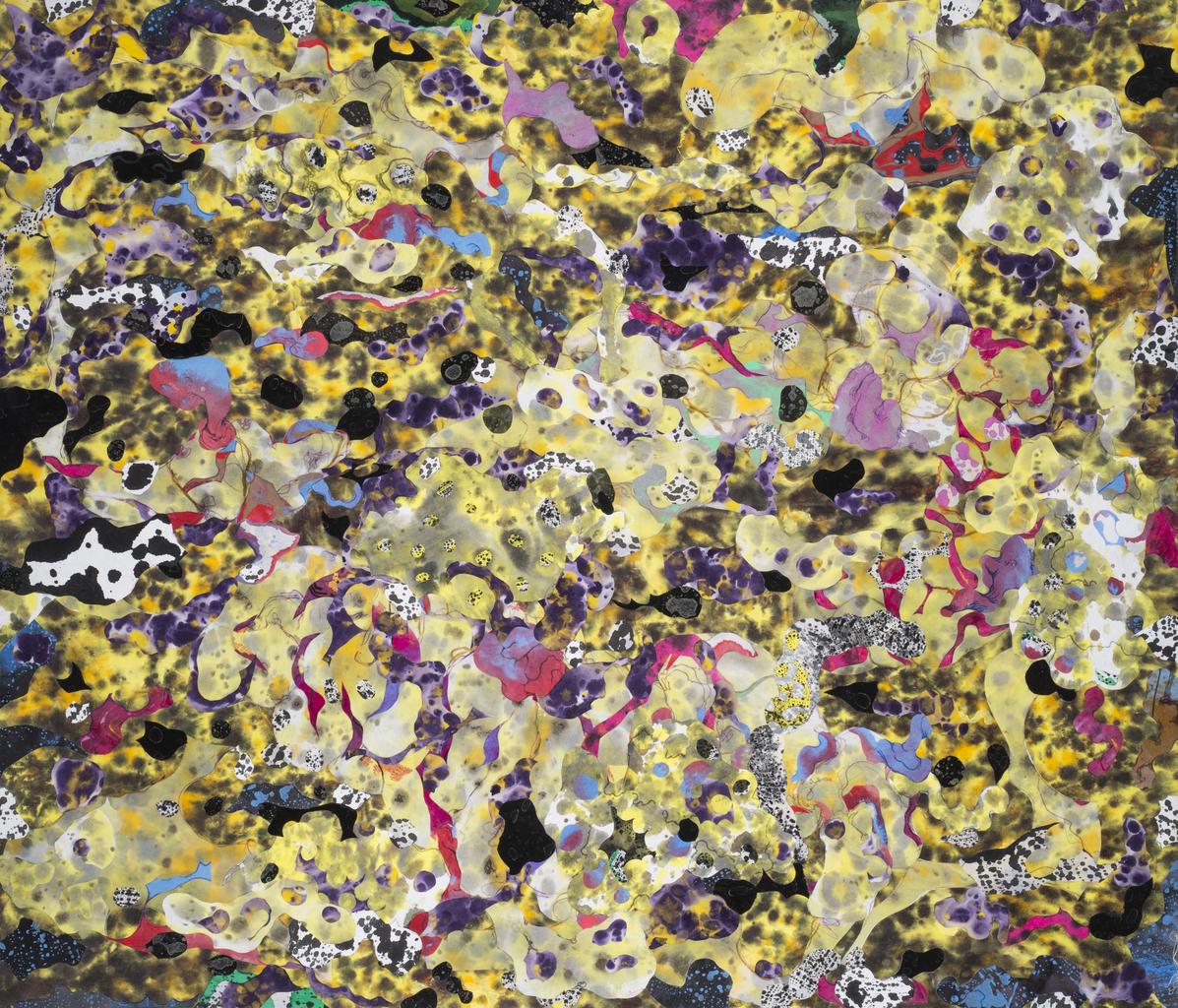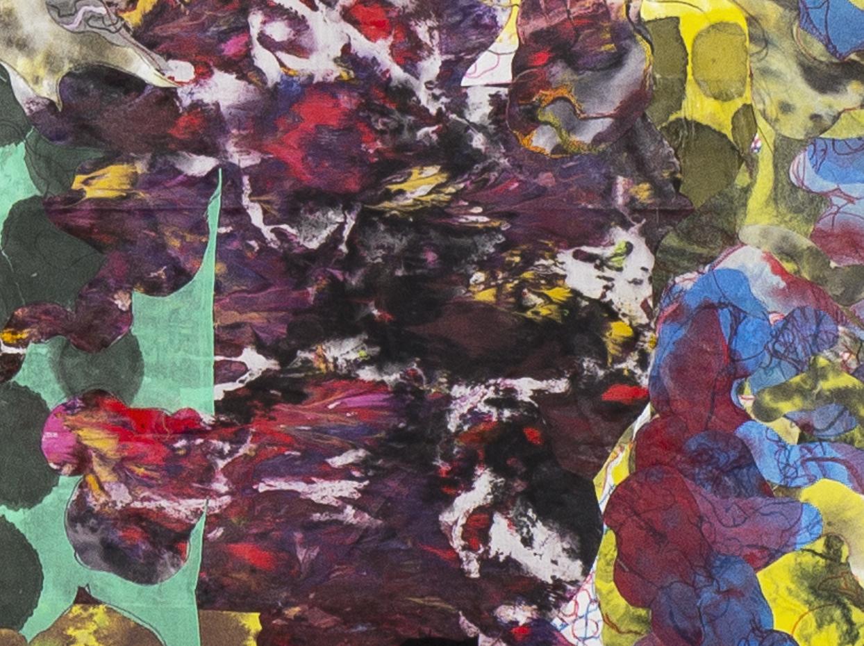 An inherent imagelessness is present as the hundreds of amoeba-like cut out samples of ink stains and brushstrokes coat the surfaces of the works, eliminating any perspectival vantage point for the viewer. We are as much inside of these paintings as we are in front of them. Our eyes grow disoriented by the endlessly complex arrangements. The components of the surfaces unify, distinctions are nullified, and definitions are evaded. In Ruggeri’s paintings the pooling, dwelling, and reticulation of the pigments unite into beautiful primordial phenomena.