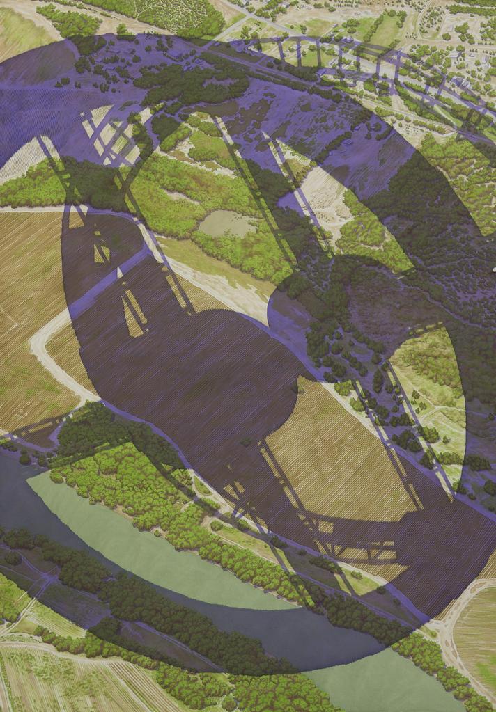 Ganske instead posits a future infrastructure where technology moves through cycles of innovation and obsolescence, and access to technology depends on location and class status—as it does today. He combines fantastical technologies with images drawn from the mining town of Centralia, Pennsylvania, a town abandoned following an underground coal fire that started in 1962 and continues to this day. Once a thriving borough on account of the coal industry, Centralia is now a ghost town felled by the very technology that once supported its population. Ganske predicts analogous setbacks within the history of the distant future, that we will always be replacing old technologies with new ones, and that any human habitat ultimately becomes a collage of time periods.