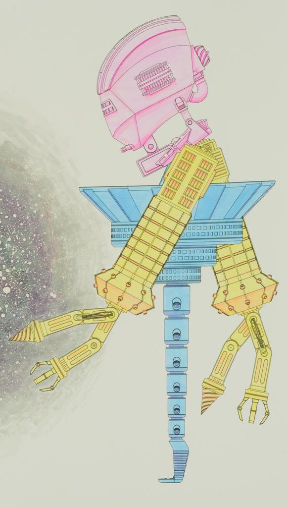 Just as Ganske’s paintings coalesce the realities of the present with future visions, so too do his new sculptures. These sculptures envision another aspect of humanity’s future: a fleet of spacecraft designed for human exploration of distant worlds. Based on the human form, Ganske designed each sculpture as a specific body part and exploratory function; for example, his “arm sculpture” is a mining vessel equipped with drilling tools and storage space for extraterrestrial ores.