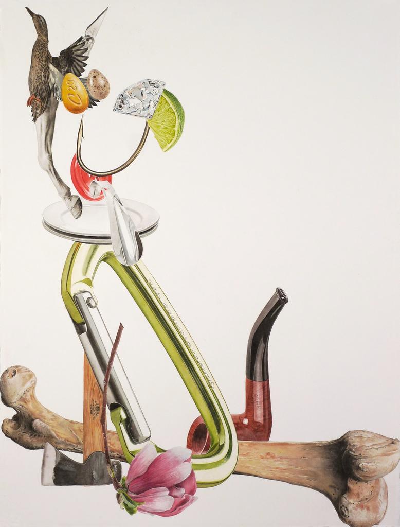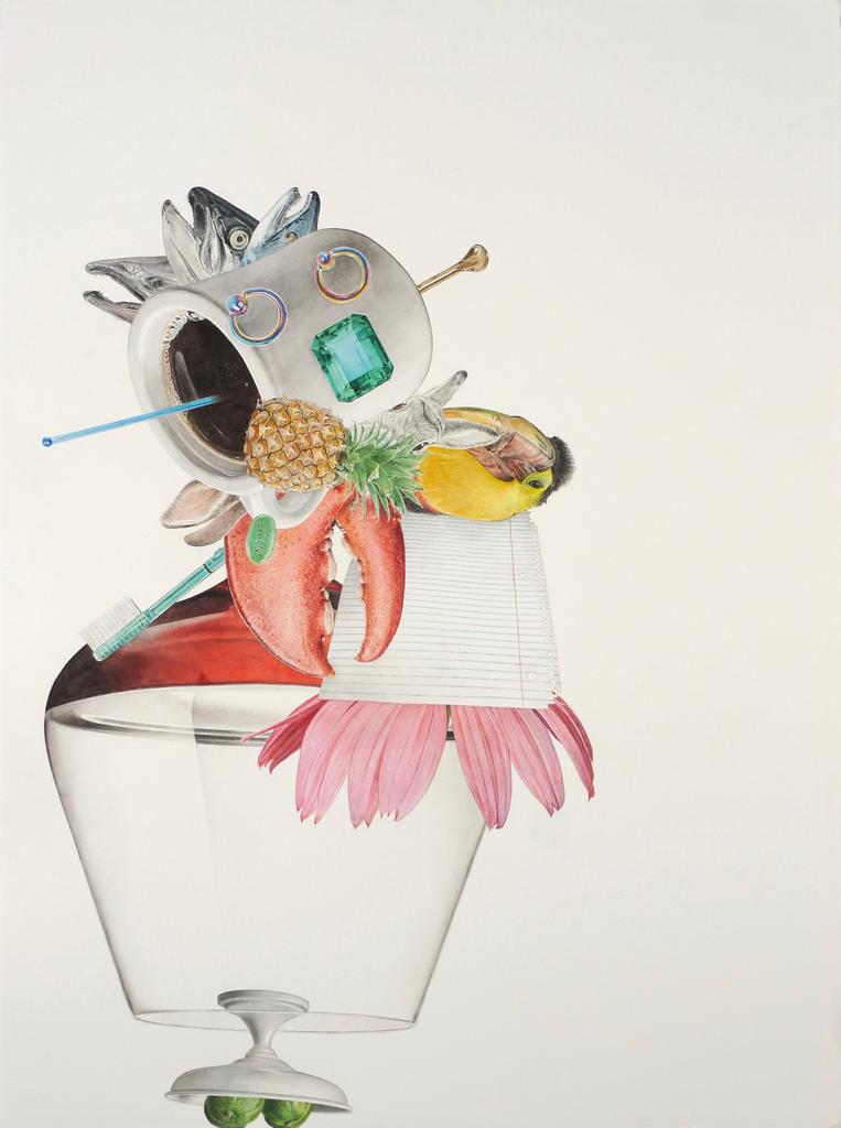 The first body of work comprises uniformly-sized watercolors, each of which constructs an iconic cartoon character from a fictional future out of a medley of photorealistic elements. While these elements may appear random at first glance, an alert viewer is rewarded with links to their contexts, both within the works themselves and without, in the broader geographic and cultural context of Seattle and its environs. Each of the characters that form the compositional bases for these works represents a specific vision of the future, much like Space Needle, and as is fitting for the home of technology titans like Microsoft and Amazon. In keeping with Steiner's past practice, these works make strategic use of negative space and are presented in crisp white frames, producing a bright, luminous atmosphere.